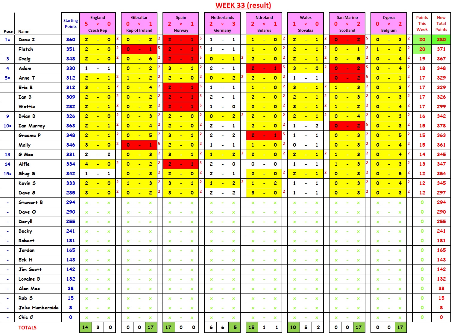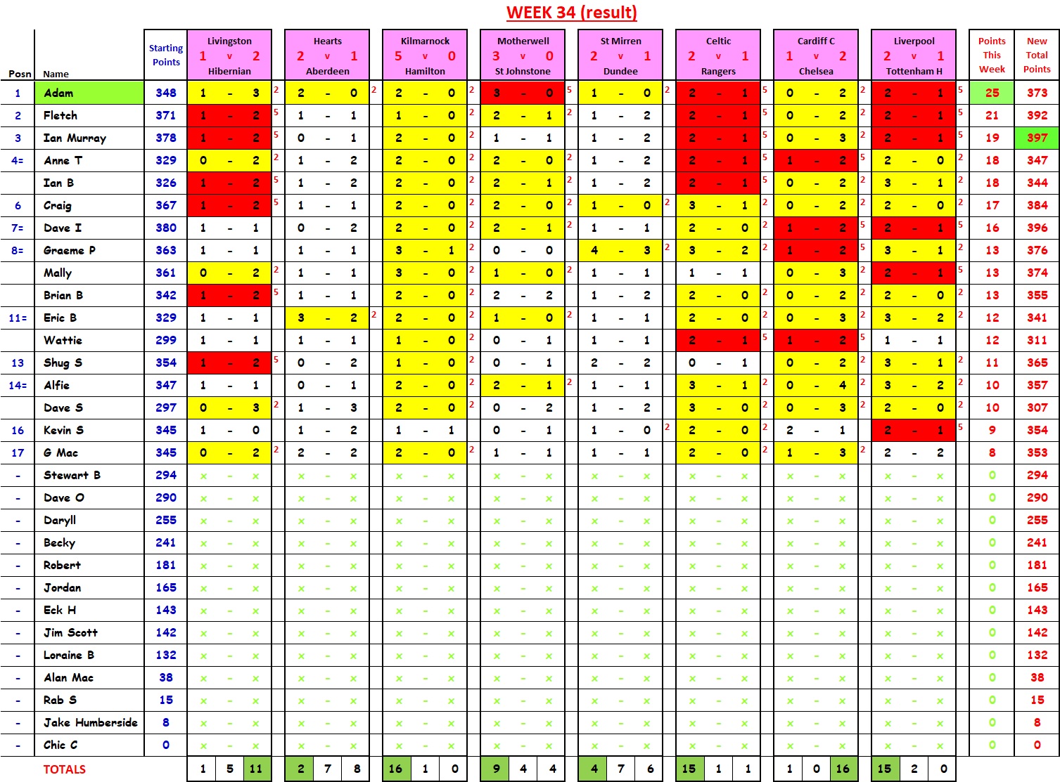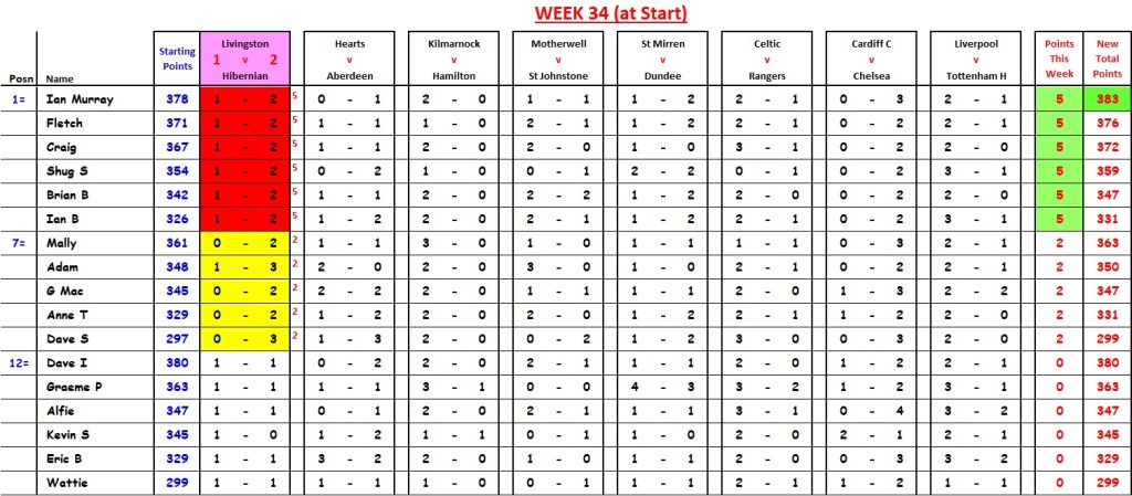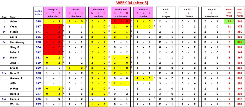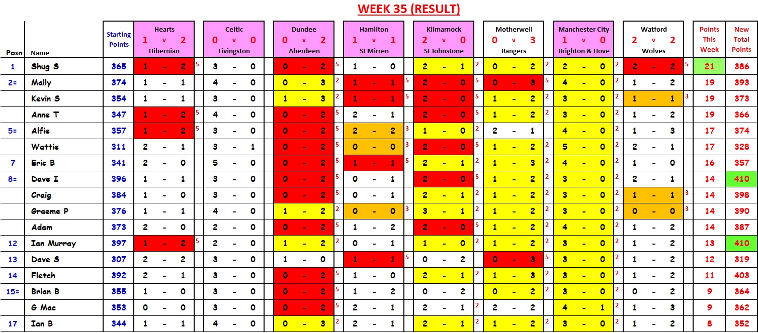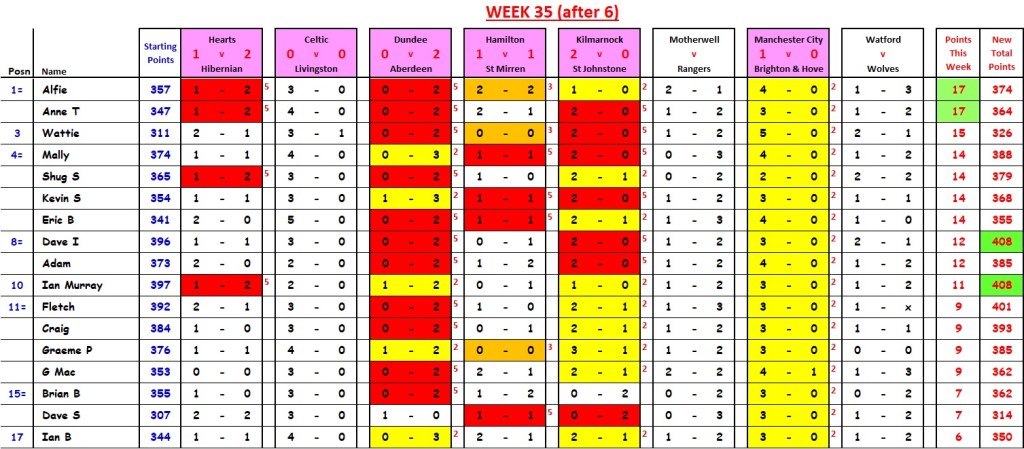 That single Watford goal (94th-minute equaliser) moved Shug from 6th place (with 16 points (trailing Anne and Mally by 8 points, at that stage)) to 1st place (beating Anne, Mally and Kevin by 2 points. “UN-BE-LIEVE-A-BLE”.