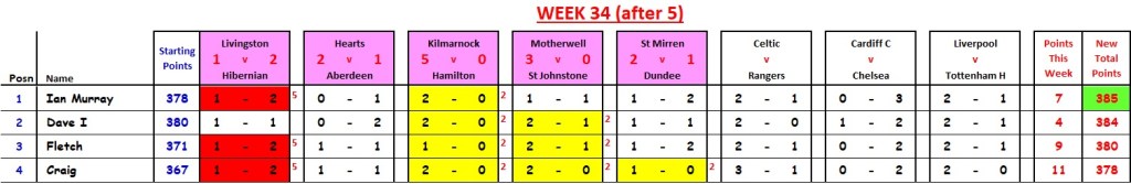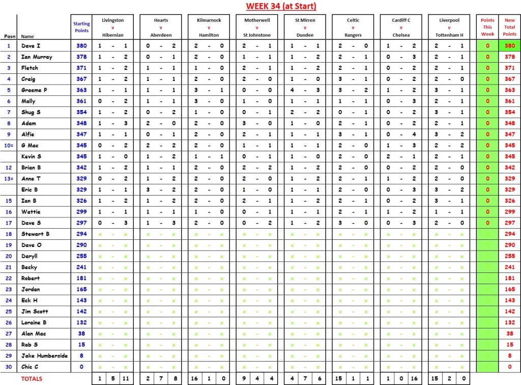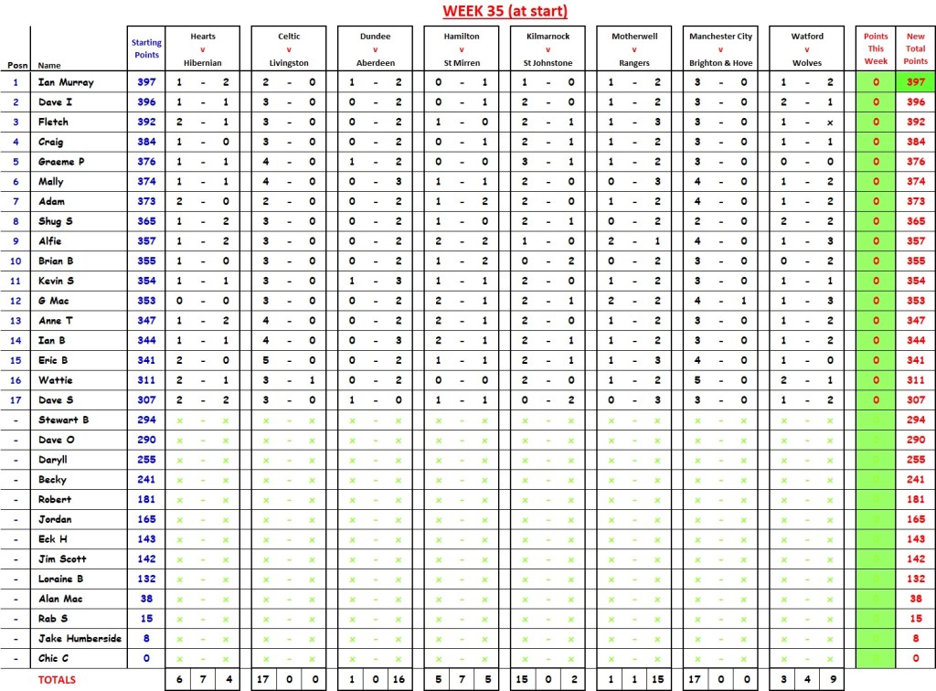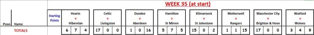 Week 36 contains 2 x Scottish Cup semi-finals, 1 x top-of-the-table(ish) Scottish Championship match (Dundee Utd v Ayr Utd (Friday 19:05)), plus 5 x crucial English Premiership games.