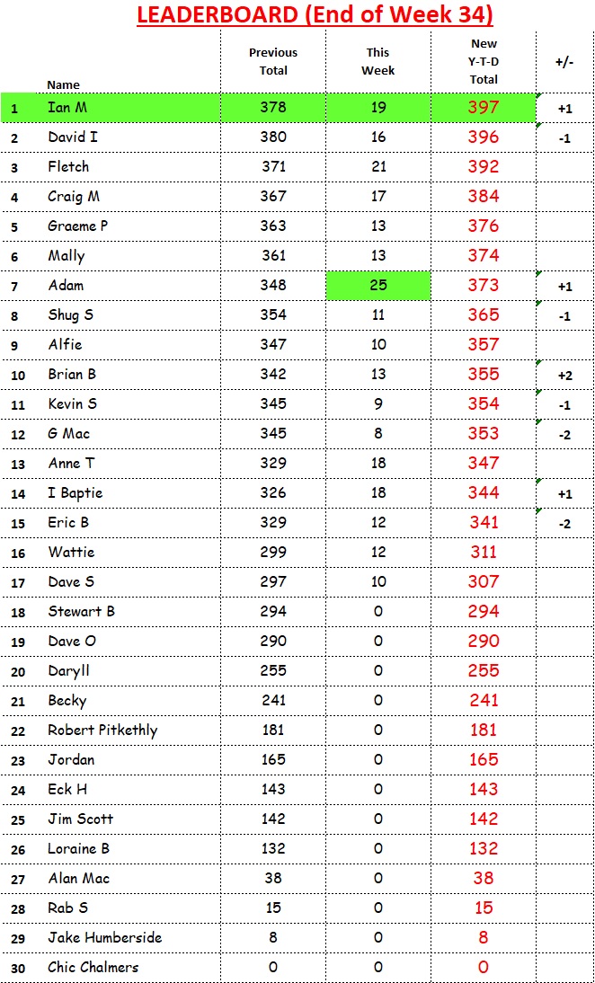Only 6 weekends to go (240 points up for grabs) so still time for someone to stage a late charge!