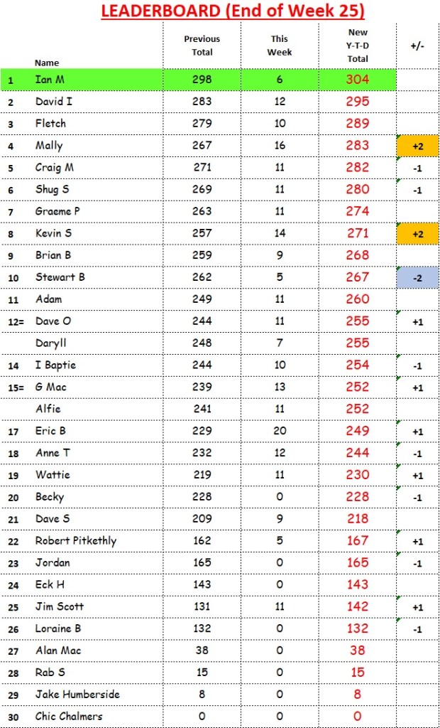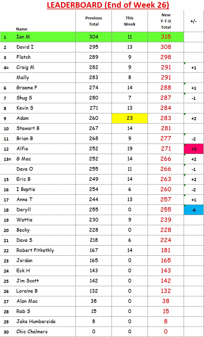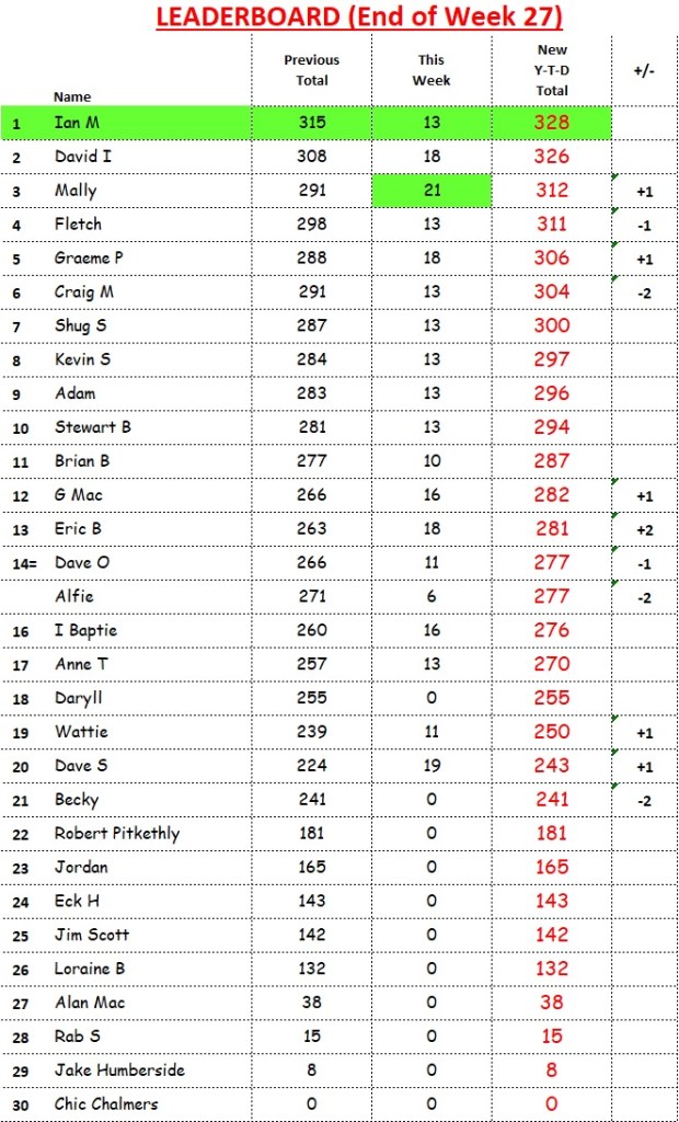 In the race for end-of-season champion, David Imlay has chopped Ian Murray’s lead down to 2 points. Mally has leap-frogged Fletch to hop into 3rd spot.